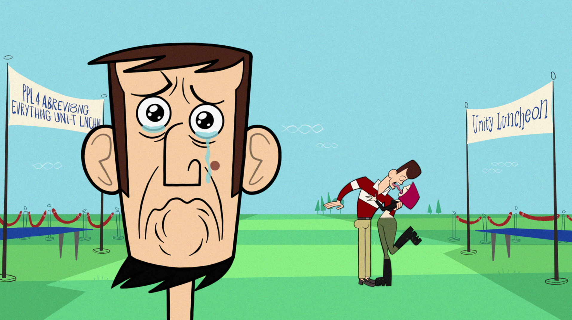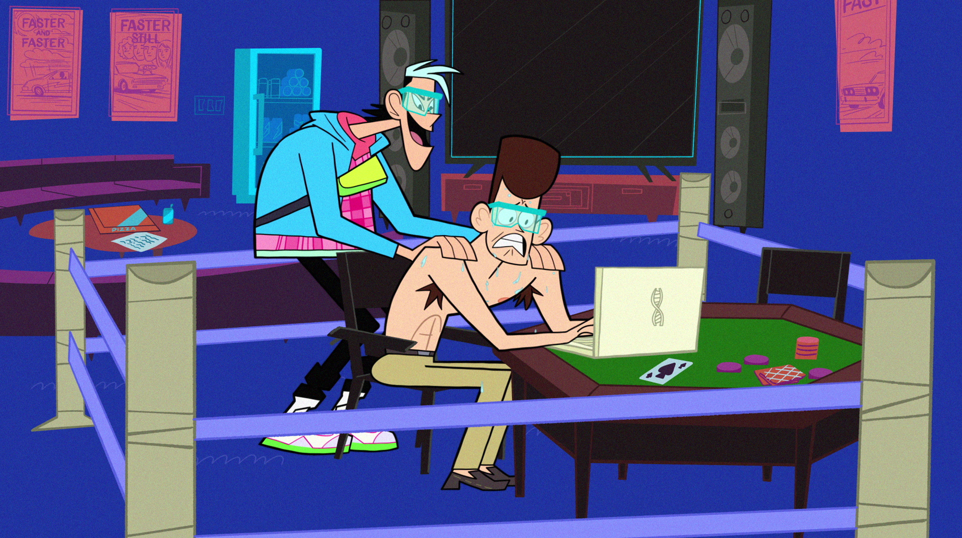 I’ve written a bit about the semantics of returning series like this one, often referred to as “reboots” or “revivals,” but I think the best way to ultimately understand Clone High is as a “rethink” for how it blends the two approaches. It’s a revival in the sense that it literally unfroze (most of) its characters and even updates the audience (and the shadowy government figures responsible for thawing them) on the central love rhombus in case they’re among those who missed the cult show the first time around. It’s a reboot given that Scudworth has been secretly operating a new version of the program in secret, such that a new group of clones are sexy teens now, and they’re also going to make it if they try alongside the originals. And it’s a rethink because how it approaches both of these shows is fundamentally informed by the passage of time in between, at least through two episodes.